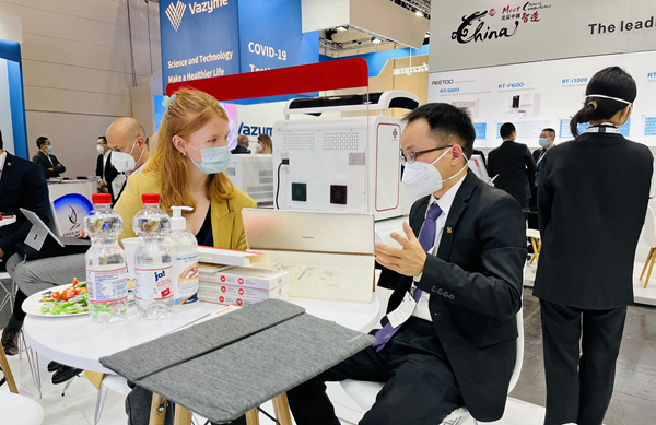 在经过同行推荐并使用了BB贝博艾弗森产品后,一位从事检测工作十多年的苏丹客户专门找到BB贝博艾弗森展台,进一步了解BB贝博艾弗森新冠和其他试剂检测业务。看完BB贝博艾弗森方案的操作后,他频频点头并表示,“你们的方案应用场景广、操作简便、精准可及,我非常看好你们!”