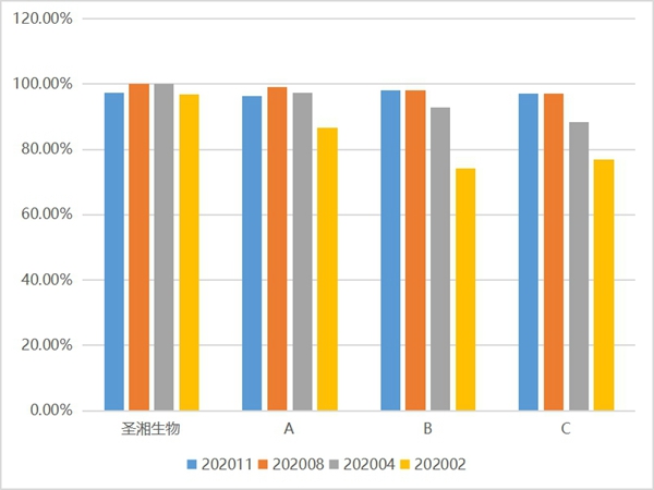 可以看出,BB贝博艾弗森生物的新型冠状病毒核酸检测试剂在检测不同浓度阳性样本时,均具备较高的符合率;尤其是对第一次2020002号640copies/mL浓度样本、第二次202009号3.5X103 copies/mL浓度样本的检出率,远超其他主流厂家。